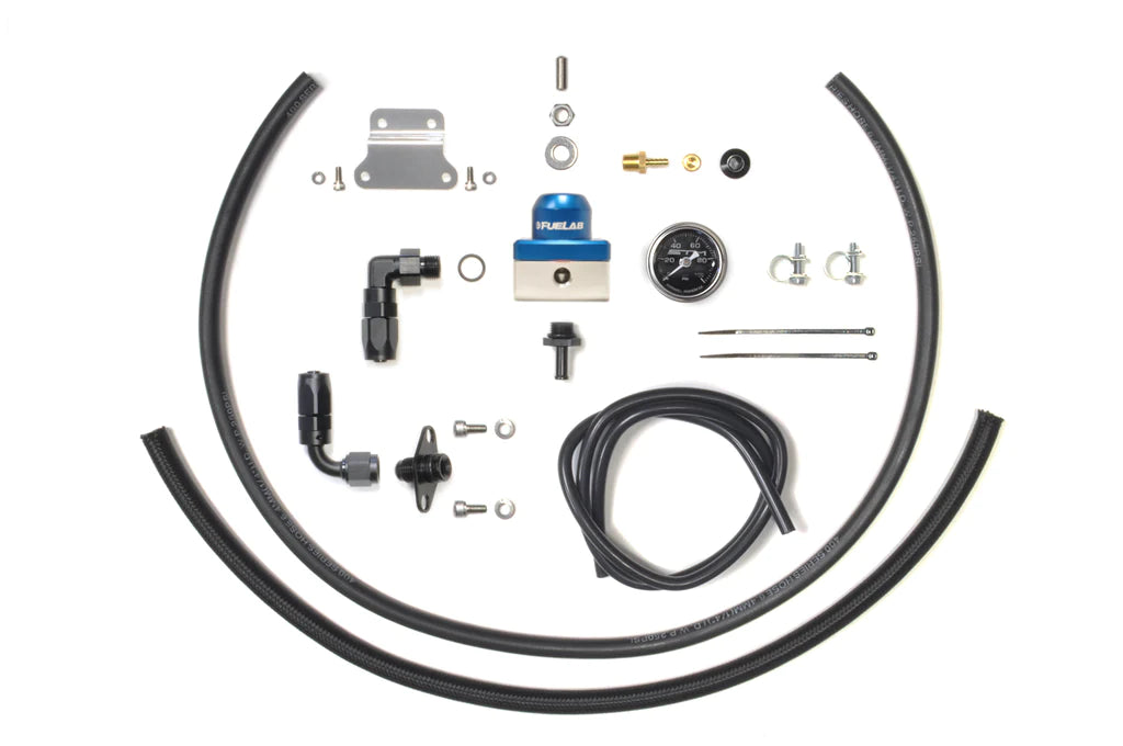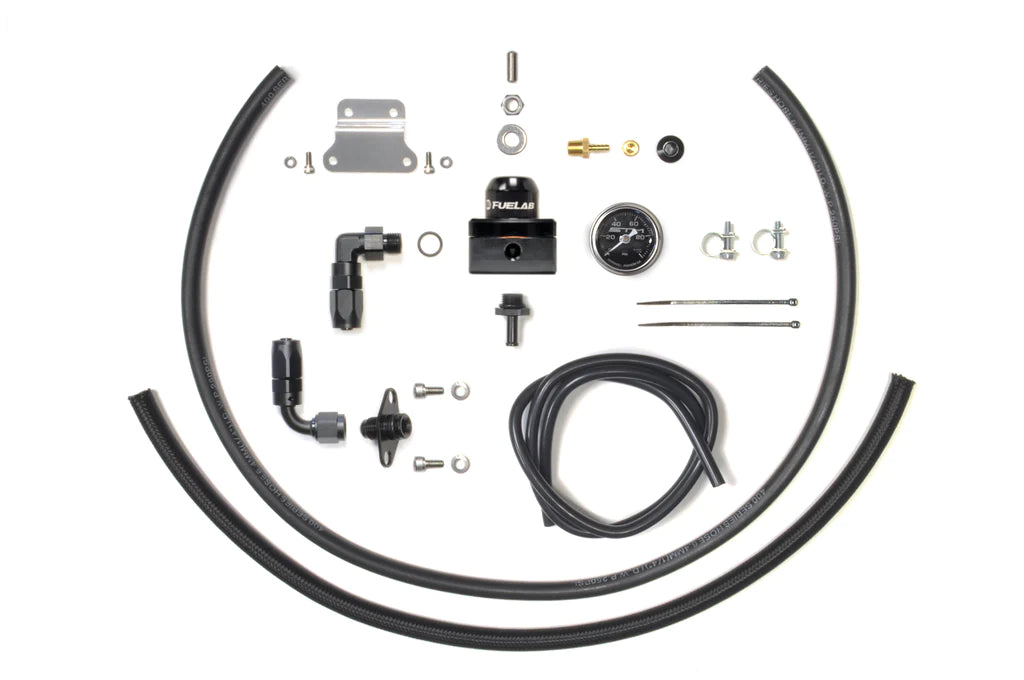 The STM 2G DSM fuel pressure regulator kit includes all fittings, hardware and line to go from your fuel rail to factory-style or -6AN outlet regulator and back to the return line. Includes the STM 2G fuel rail fitting for a direct fit to your fuel rail. The mini Fuelab regulator is available in your choice of 6 colors and of course, the whole kit is E85 safe!