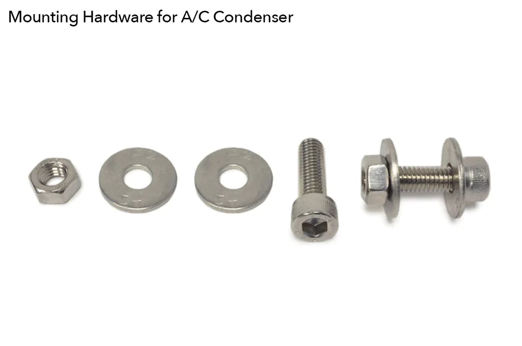 If you still have A/C, the condenser needs to be adjusted forward for a proper fitment. There are two mounting bolts on the top ends of the condenser. Remove the spacer and bolt it back in place using the included stainless hardware. This allows the condenser to sit forward another 1/4 inch. The car pictured has A/C, as installed.