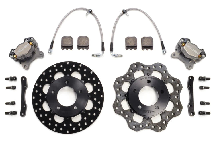 The STM Lightweight Rear Drag Brake Kit for Evo X allows you to ditch the weight of your big, heavy Brembos and rotors and clears room to run smaller wheels and slicks. With a total weight of only 10.7 pounds per side with the scalloped rotor, you will drop almost 30 pounds. We all know less rotating mass is the best way to free up power! The STM brake kits include Wilwood calipers and your choice of the standard rotor or the lightweight scalloped rotor, custom STM aluminum mounting brackets, black anodized rotor hats, STM brake lines and all mounting hardware. Vehicle Fitment: 2008-2015 Mitsubishi Lancer Evolution X More Info: This brake set-up is specifically designed for Drag Racing. This is not intended for constant, on/off braking as in road-racing or autocross. Will clear most 15" wheels. The scalloped rotor is 1.95 pounds lighter than the standard rotor and is recommended for cars that see more miles on the drag strip than on the street. The scalloped rotor is not a street rotor. STM Rear Drag Brake Kit Includes: Wilwood Dynapro Single Calipers Wilwood Brake Pads Choice of Wilwood Rotor (Standard or Scalloped) Black Anodized Hat Color STM Brake Lines Aluminum Mounting Brackets Mounting Hardware Weight Savings: Save 25.40 pounds with the standard rotors Save 29.30 pounds with the scalloped rotors Standard Rotor Brake Kit Specs: • 21.40 pounds • Weight per side: 10.70 pounds (Rotor, Caliper, Hardware, Line) • Rotor assembly only: 7.25 pounds Scalloped Rotor Brake Kit Specs: • 17.50 pounds • Total weight per side: 8.75 pounds (Rotor, Caliper, Hardware, Line) • Rotor assembly only: 5.30 pounds Factory Weights: • 23.40 pounds • Stock Evo X Rear Rotor: 18.6 pounds • Stock Evo X Rear Caliper: 4.3 pounds Install Notes: You will need to remove the E-Brake. Staging Brake is suggested. The Dust Shield must be modified as well. IMPORTANT NOTES - For Drag Racing Only! These brakes are designed for OFF ROAD USE ONLY and drag racing applications. They are NOT intended for consecutive, hard braking. These are not for road racing or autocross or daily street use. While these are also the same brakes we run on our STM 8 second cars, as with anything performance-oriented, please be sure to check and double-check every aspect for safety, EACH AND EVERY PASS! Please use your discretion and drive safely. Shipping Times: 1-14 Days Hand assembled in-house, please give us time to package your parts!